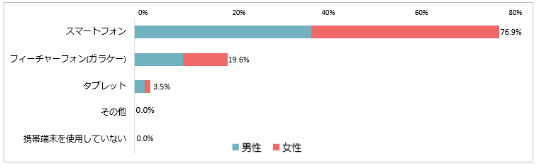 「携帯端末の種類」を尋ねる調査が行われたところ、「スマートフォン」と回答した割合が76.9%。