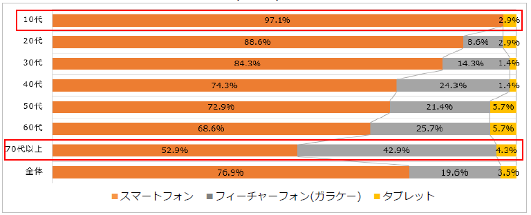 年代が上がるにつれて「フィーチャーフォン(ガラケー)」と回答した割合が高くなる傾向だが、70代以上でも42.9%にとどまり、「スマートフォン」と回答した割合が半分以上(52.9%)を占める結果となった。